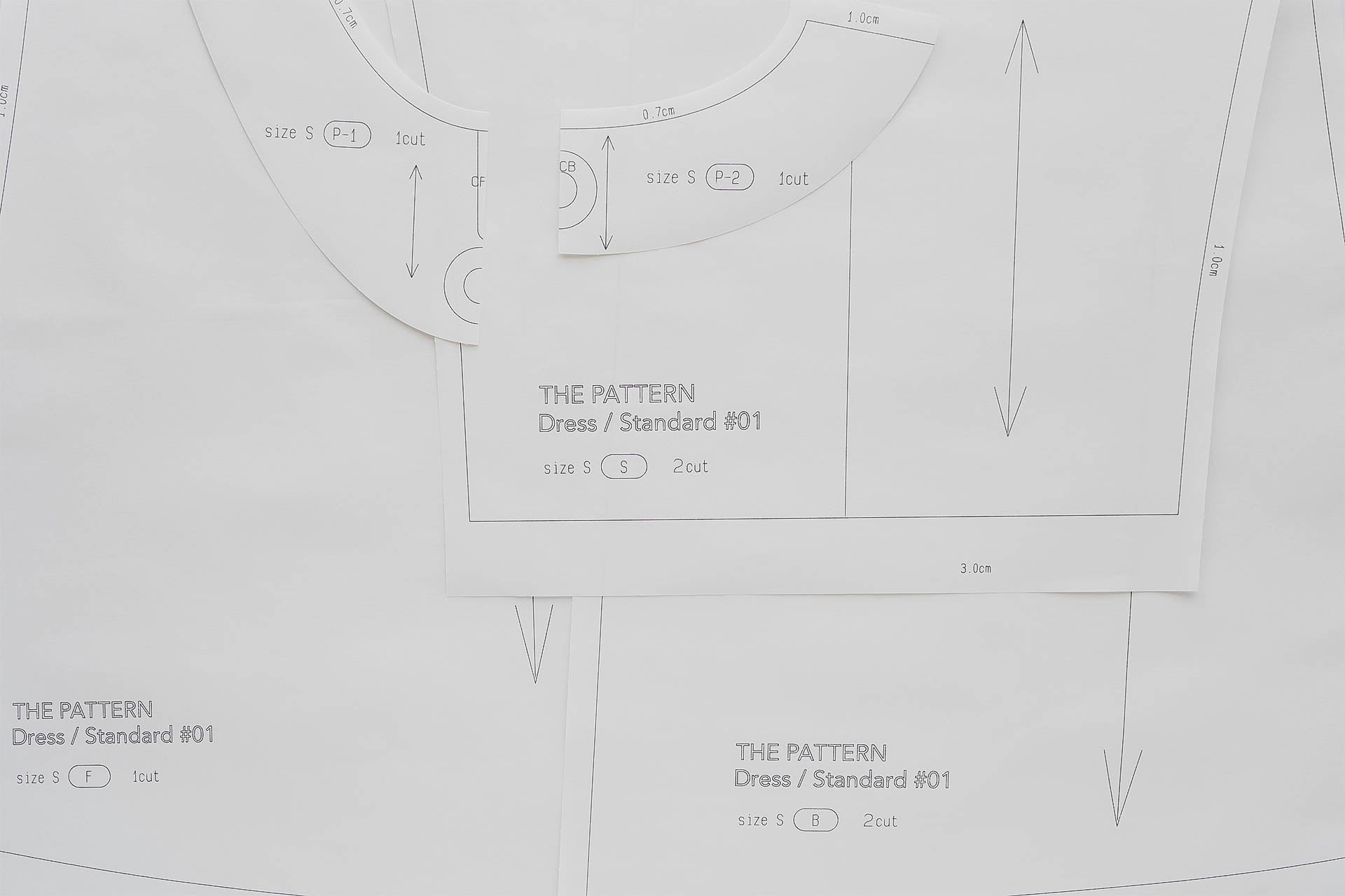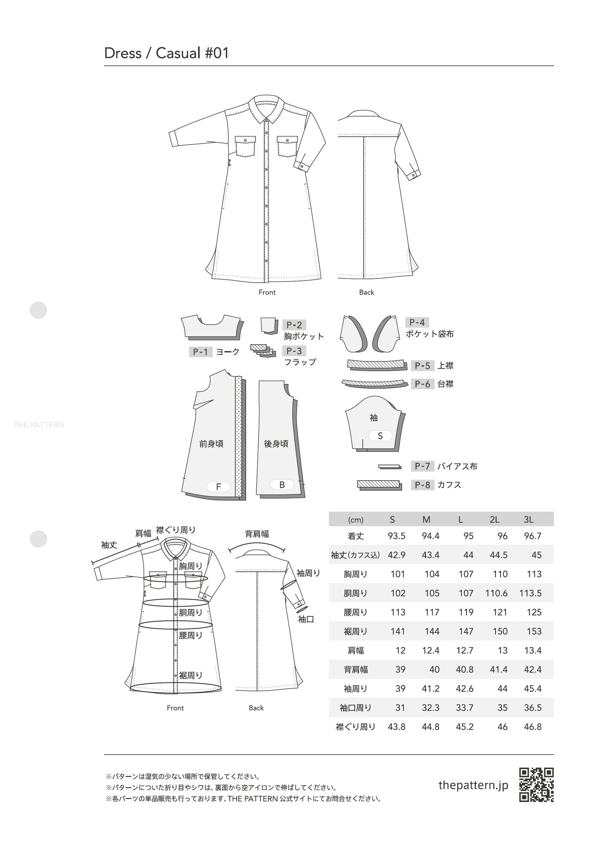 >商品内容説明・Dress / Casual #01 Pattern パターン材料(10パーツ/ F・B・S・P-1・P-2・P-3・P-4・P-5・P-6・P-7・P-8)・商品説明書・パターン仕様書
